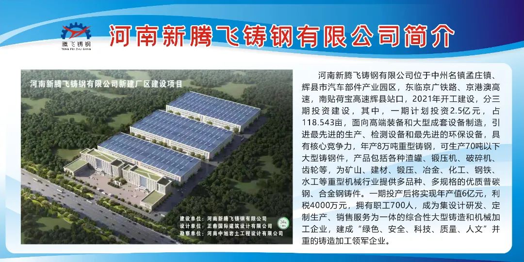 因鑄件產品供不應求,為了更好服務客戶,公司投資2.5億元資金,新建“河南新騰飛鑄鋼有限公司”,占地面積120畝,打造年產8萬噸高 端裝備制造大型優 質鑄鋼件生產基地。
